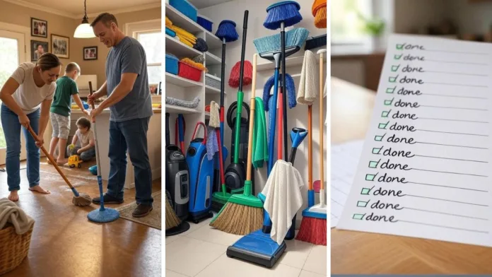 Jangan buat sorang-sorang. Bahagikan tugas ikut kemampuan dan umur. Anak-anak boleh tolong susun mainan, suami/isteri boleh tackle dapur atau ruang tamu. Bila buat sama-sama, kerja jadi bonding time dan lebih cepat siap.